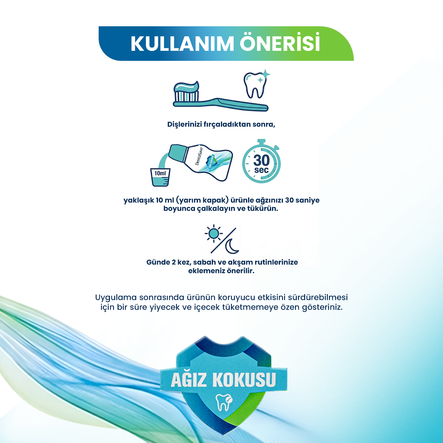 Usage Recommendation Dişlerinizi fırçaladıktan sonra, yaklaşık 10 ml (yarım kapak) ürünle ağzınızı 30 saniye boyunca çalkalayın ve tükürün. Günde 2 kez, sabah ve akşam rutinlerinize eklemeniz önerilir. Uygulama sonrasında ürünün koruyucu etkisini sürdürebilmesi için bir süre yiyecek ve içecek tüketmemeye özen gösteriniz.