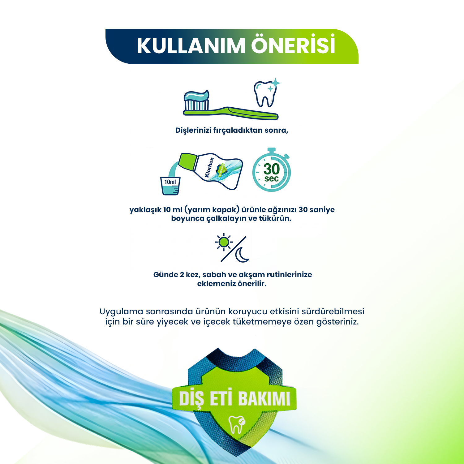 Usage Recommendation Dişlerinizi fırçaladıktan sonra, yaklaşık 10 ml (yarım kapak) ürünle ağzınızı 30 saniye boyunca çalkalayın ve tükürün. Günde 2 kez, sabah ve akşam rutinlerinize eklemeniz önerilir. Uygulama sonrasında ürünün koruyucu etkisini sürdürebilmesi için bir süre yiyecek ve içecek tüketmemeye özen gösteriniz.